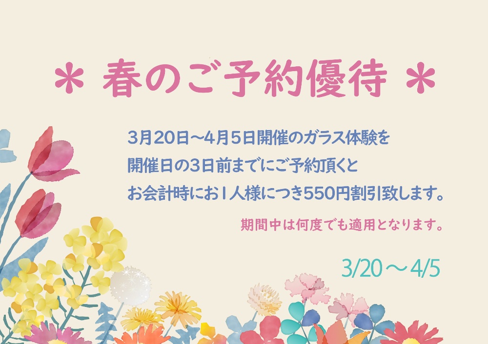 事前予約で割引のチャンス! 春休みに赤穂に来られる予定の方はお見逃しなく。 体験の予約ページから開催日や選べる体験の種類を確認できます。 前日や当日の予約は予約フォームからは出来ませんので公式LINEもしくは店頭にて空きをご確認ください。